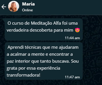 Com a adesão ao Curso de Meditação Alfa, você ganha ingresso imediato à nossa comunidade exclusiva de alunos. Este é um espaço vibrante e envolvente onde você poderá interagir com alunos de todo o Brasil!